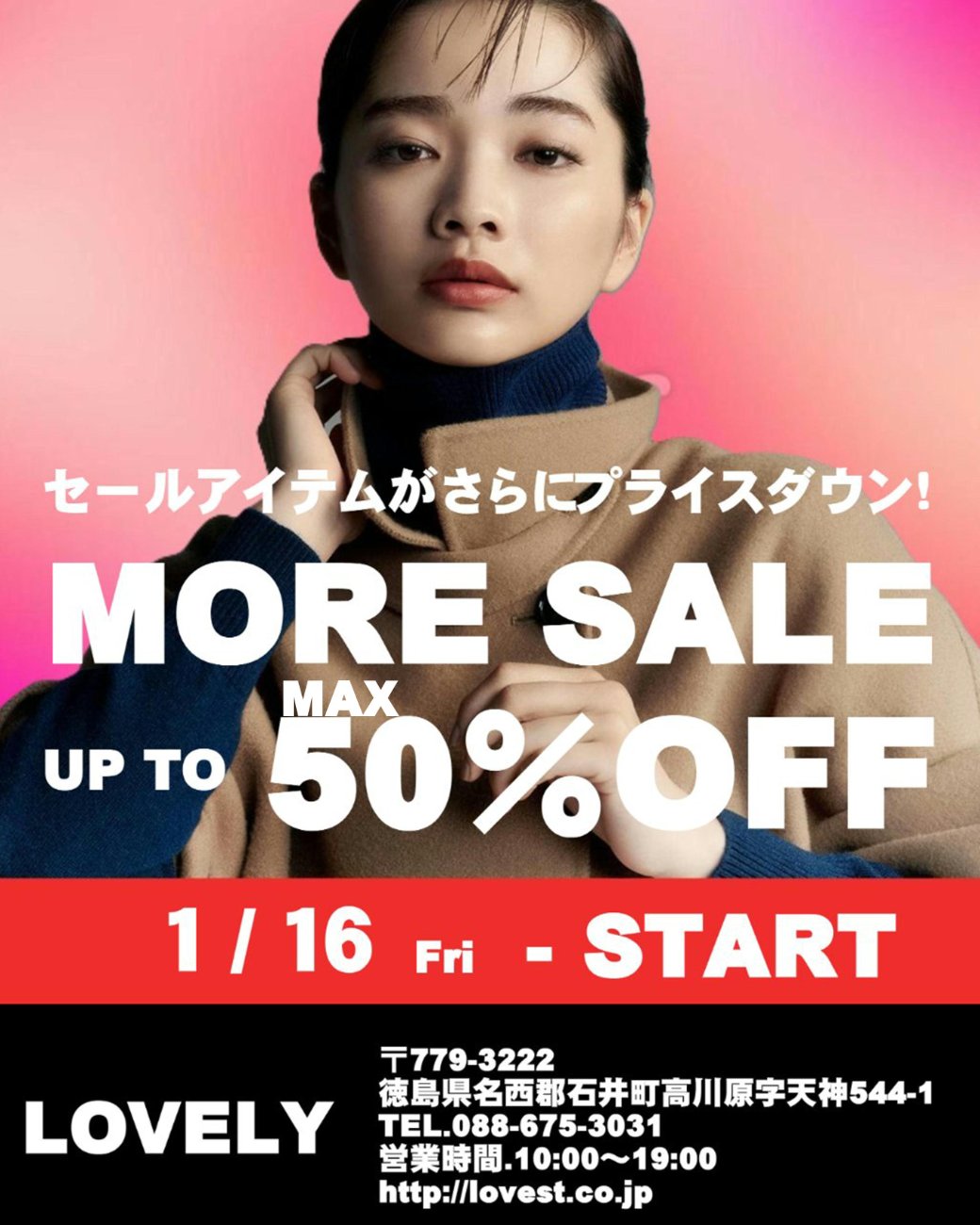 50%OFF SALE / LOVELY店 2026.01.13 MORE SALE 秋冬シーズンの対象アイテムが、さらにプライスダウン! 特別なこの機会に、是非ラブリーでのお買い物をお楽しみくださいませ。 Max 50%OFF SALE 1/16(金)START LOVELY 徳島県名西郡石井町高川原字天神544-1 open.10:00~19:00 tel.088-675-3031